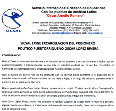 SICSAL EXIGE EXCARCELACION DEL PRISIONERO POLITICO PUERTORRIQUEÑO OSCAR LOPEZ RIVERA
