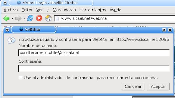 vacía en la que se rellena el Nombre de usuario (por ejemplo comiteromero.chile@sicsal.net) y la Contraseña).