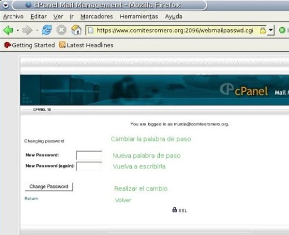Se trata de un distribuidor que permite hacer varias cosas, entre ellas, utilizar uno de los tres programas de correo que existen en el webmail de comitesromero.org; cambiar la palabra de paso (password) y configurar el reenvío automático de copias (a una o a varias direcciones de correo) de todos los mensajes que lleguen a este buzón. Nos vamos a concentrar en el cambio de la palabra de paso y por ello hacemos click en Change Password